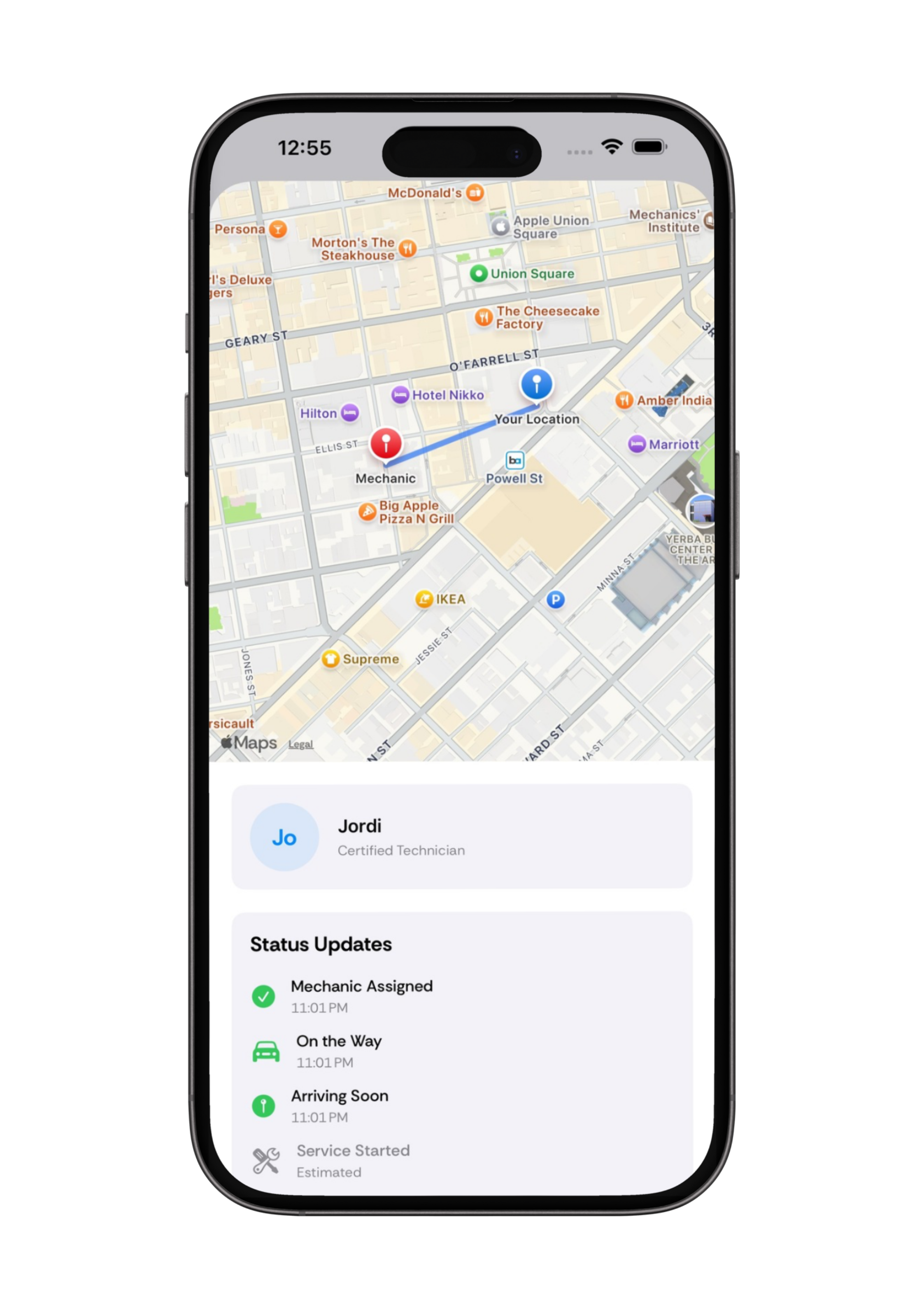 See your technician's live location and status updates in real-time as they head to you.